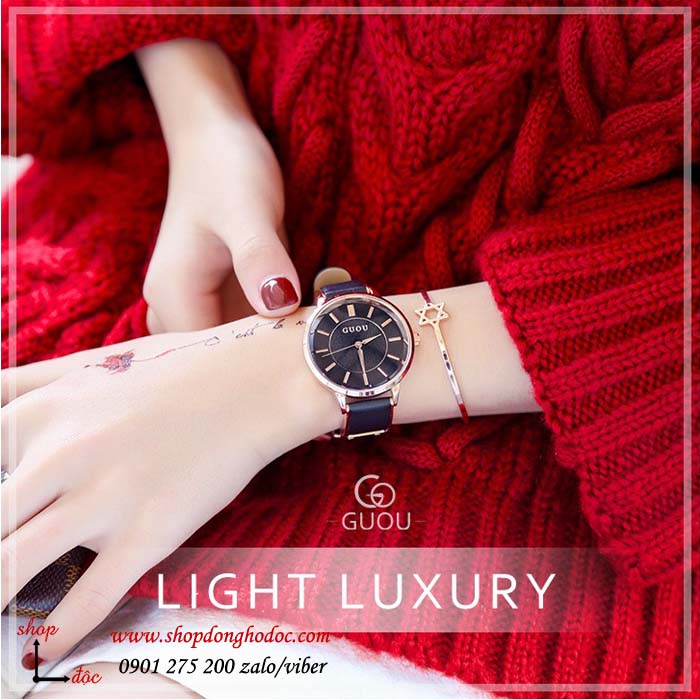 Đồng hồ nữ dây da mặt tròn đen cá tính Guou ĐHĐ22904