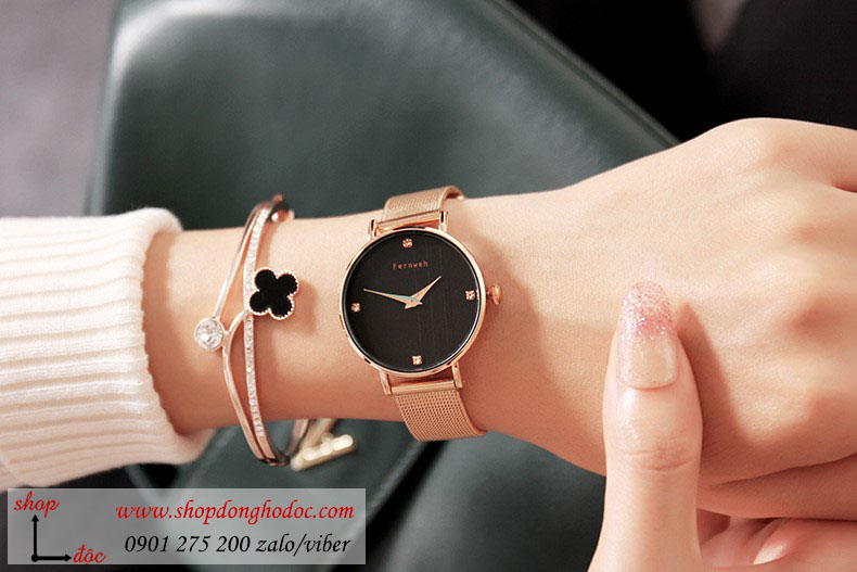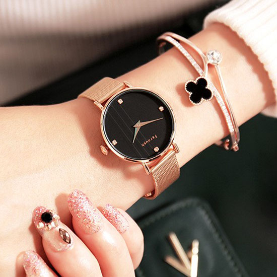 Đồng hồ nữ dây kim loại lưới vàng mặt tròn đen quý phái ĐHĐ7202